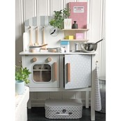 キッチンには、オーブン、蛇口が付いたシンク、ガスコンロ、時計、収納棚あり、全てのものを収納できるようになっています。